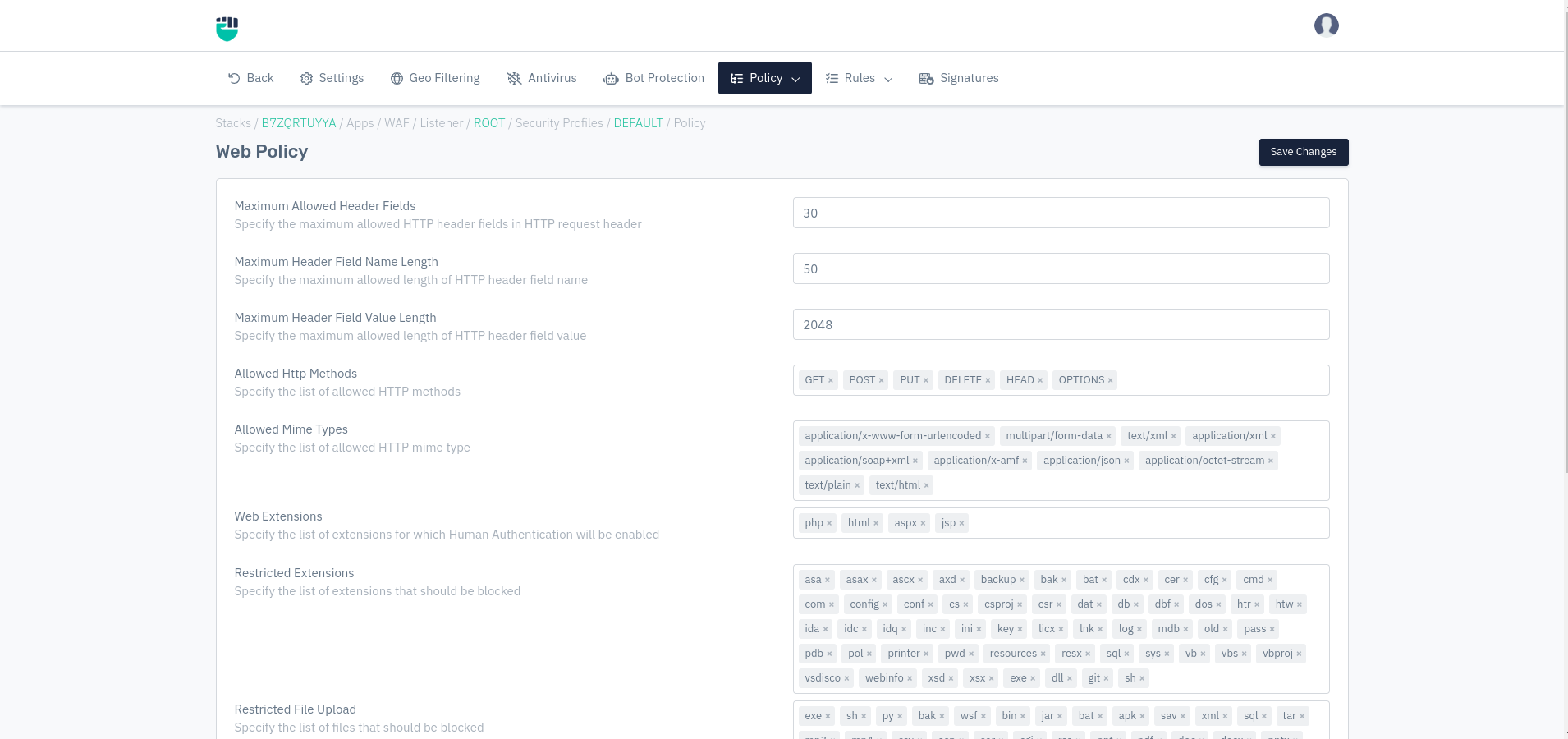 - Go to WAF > Listener > Profiles > Policy > Web Policy.