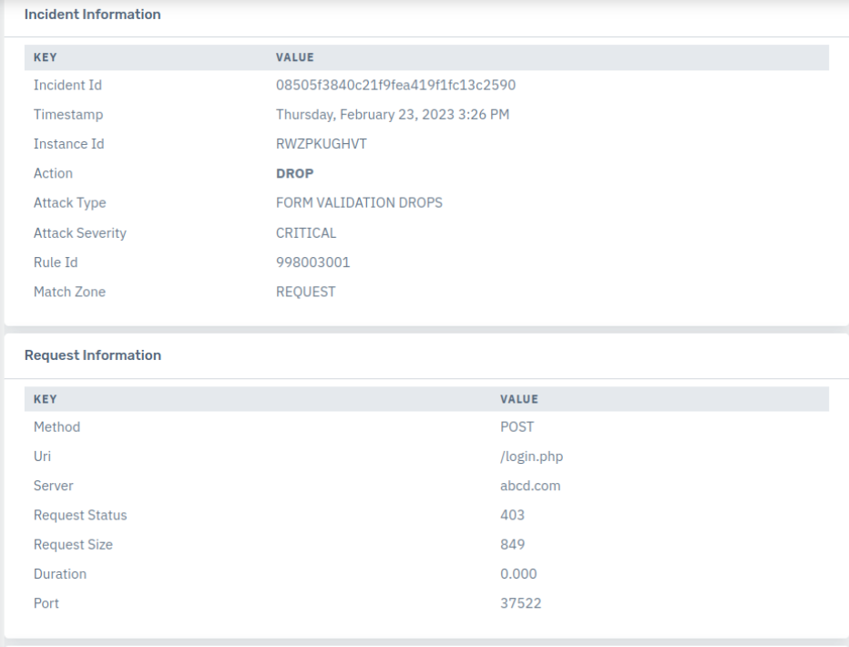 As we can see that from above picture the request has been blocked because we specify values or a range of values for various form fields of a web application form also we have to check the incidents to know about the detailed information of blocked request.