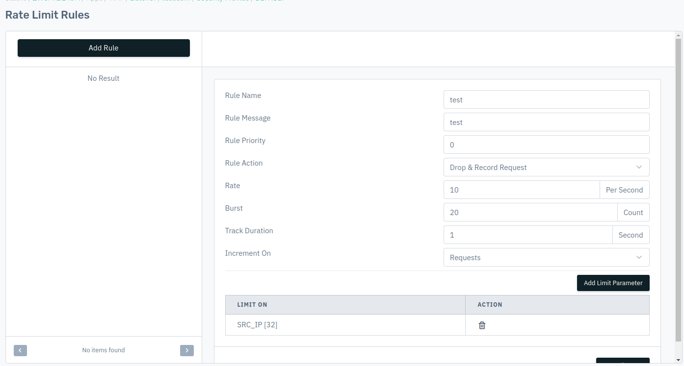 2.Go to Apps > WAF > Listener > Profile > Profile default setting > Profile Rule > Rate Limit Rule > Add Rule > Save changes.