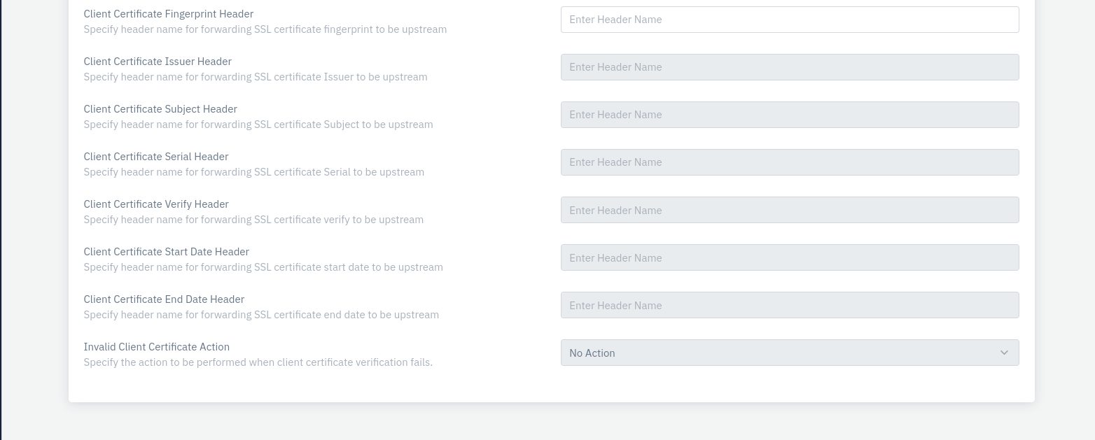 This option allows users to specify header names for forwarding SSL certificate fingerprints to be upstream.