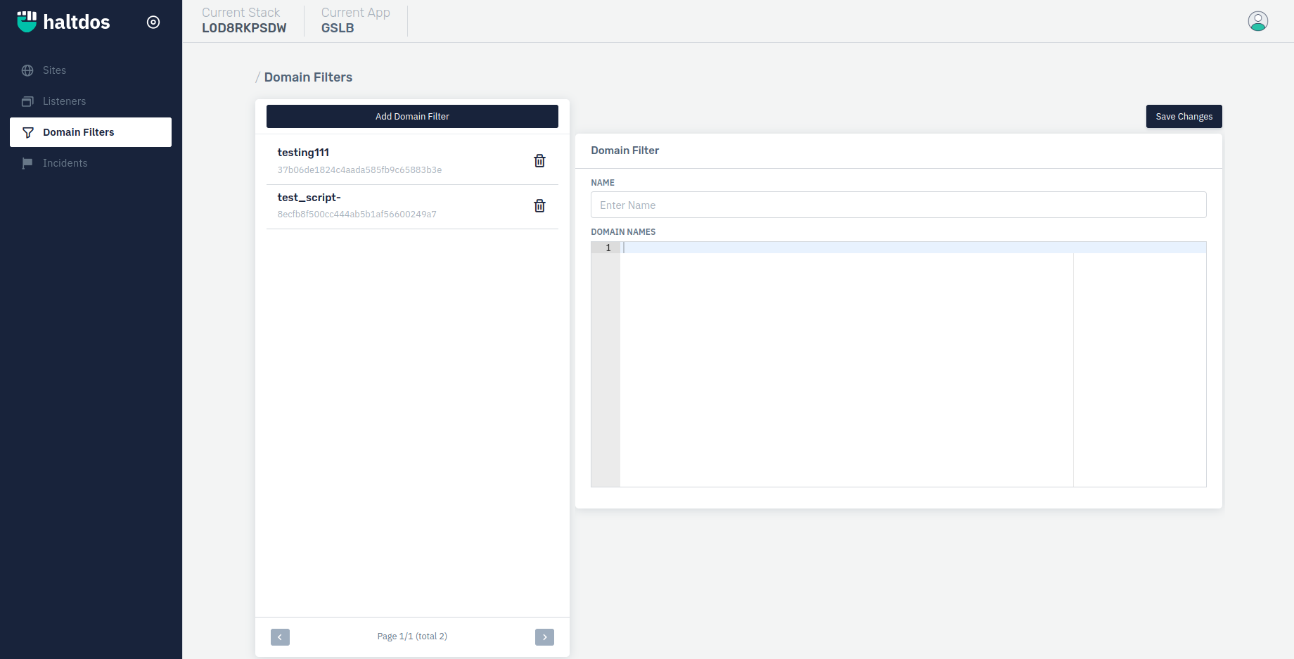- Go to Apps > GSLB > Listener > Domain Filter